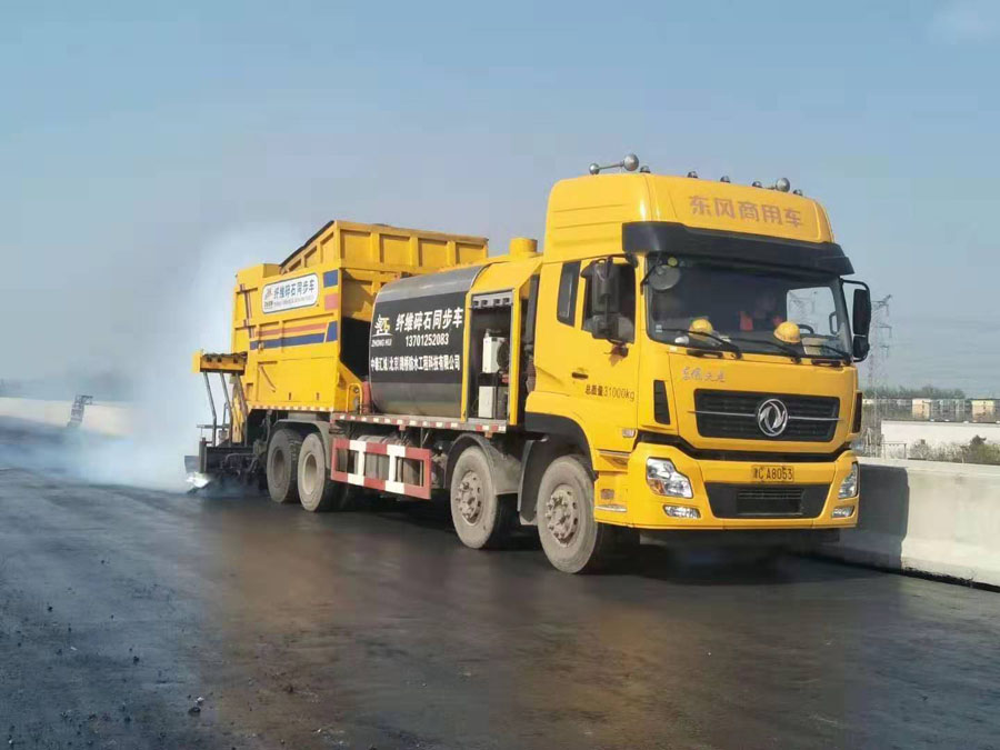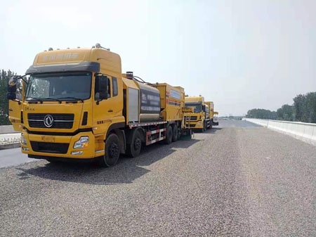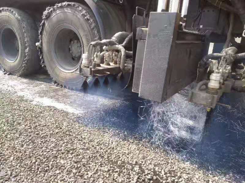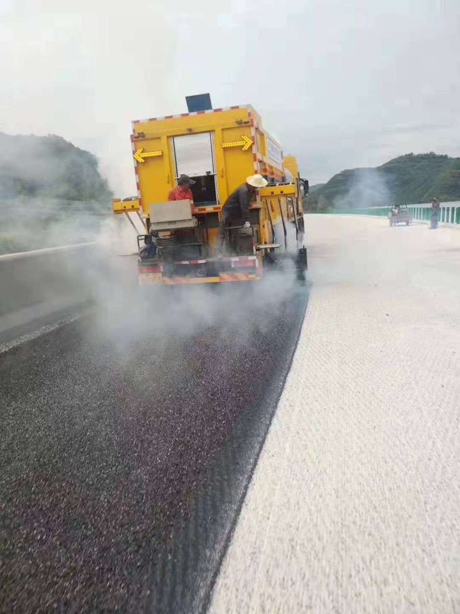 一、熱熔改性橡膠瀝青纖維碎石同步防水優點與應用 1.該防水四同步作業施工,減少了傳統工藝乳化瀝青的破乳時間,大大的縮短了施工時間。該工藝特別適合于因交通量大而不能夠長時間封閉的道路。 2.由于是同步作業,集料能夠迅速嵌入纖維與改性橡膠瀝青形成的網狀結構中,成型后集料被結合料網狀結構緊緊裹縛,形成一個復合的力學嵌鎖體系,纖維、瀝青和骨料緊密相連,有效地先治療骨料的滑移,脫落,使其具有高耐磨性。 3.纖維和改性橡膠瀝青優良的抗拉能力、彈性恢復能力及耐高溫能力使其具有高穩定性能。 4.良好的抗裂性能、抗變形能力,較高的粘結性能,快速同步施工減少的層間污染等優點使其具有高粘結防水性能。良好的應力吸收和擴散能力,能夠有效地抑制基面反射裂縫和低溫收縮裂縫的發生。 5.該防水應用于橋面水泥混凝土和瀝青混凝土之間的防水粘結層。舊水泥路面或舊瀝青路面上加鋪瀝青路面時,作為層間粘層應力吸收層,防止反射裂縫。 6.作為瀝青路面、裂縫路面的養護。 7.新建公路時,作為油面和基層之間的防水粘結層。 8.作為機場跑道的防水下封層。